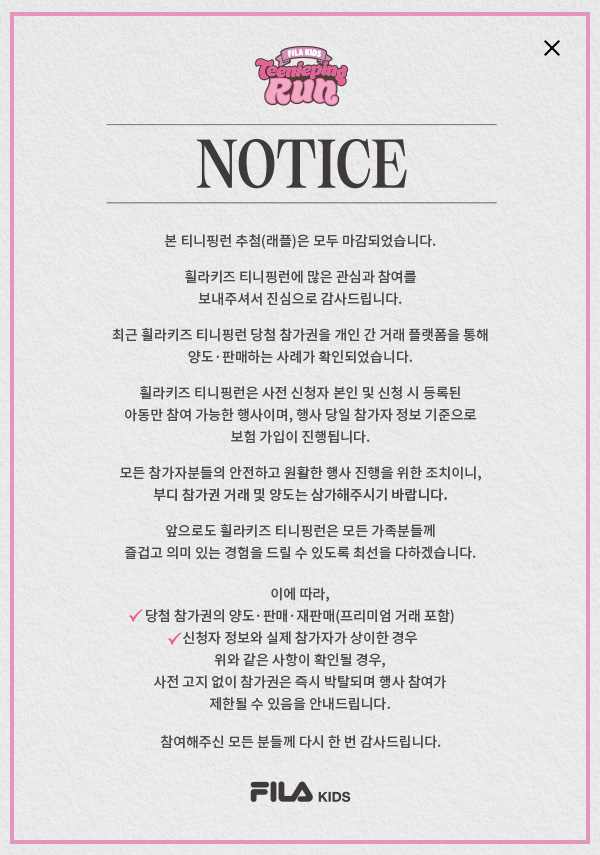 휠라키즈 티니핑런은 반드시 신청자 본인의 정보를 등록해야 합니다.