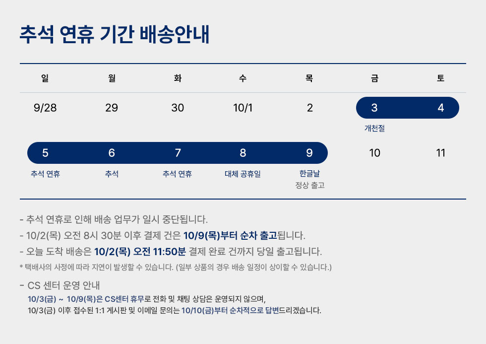 추석 연휴 기간 배송 안내